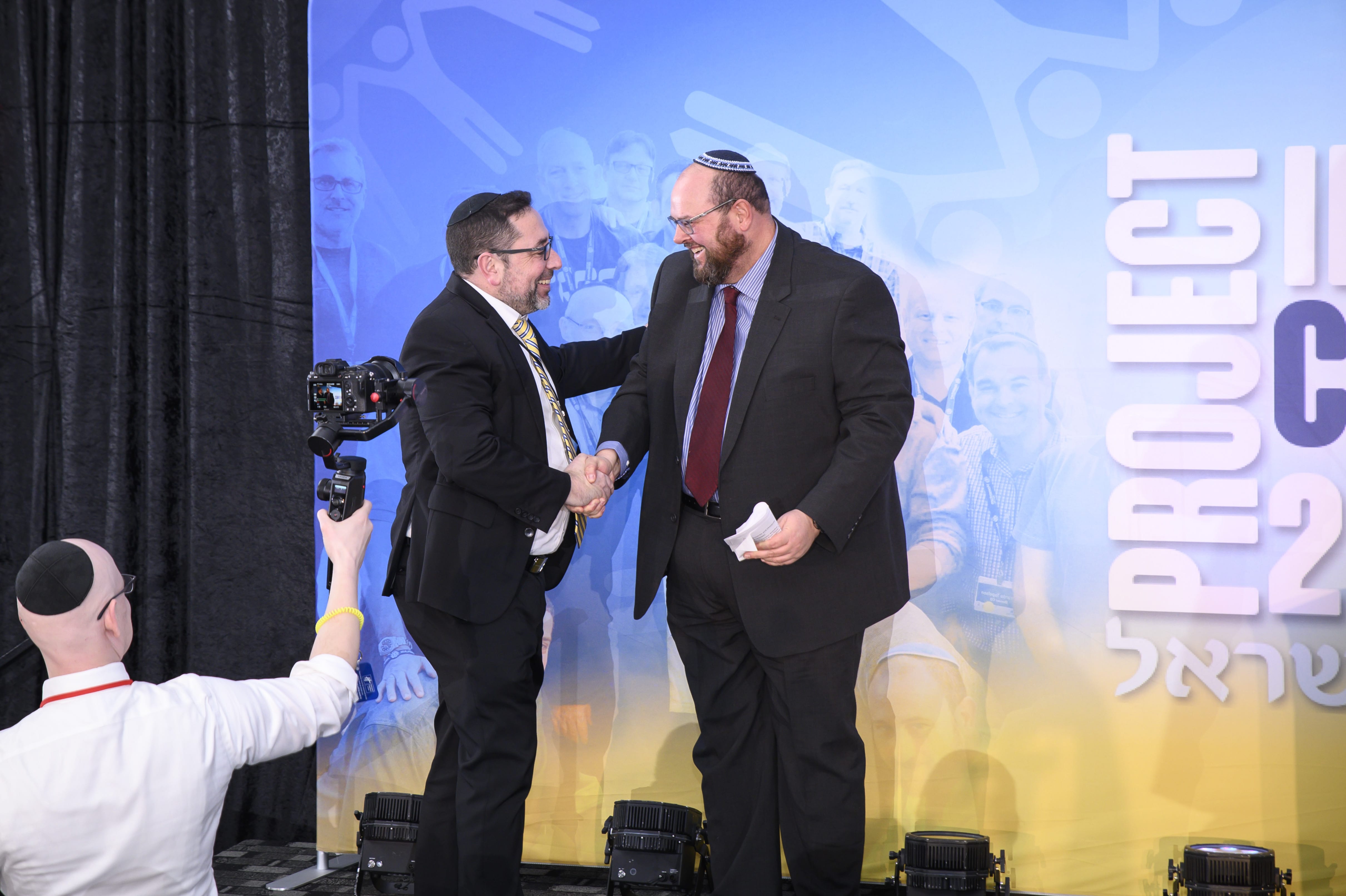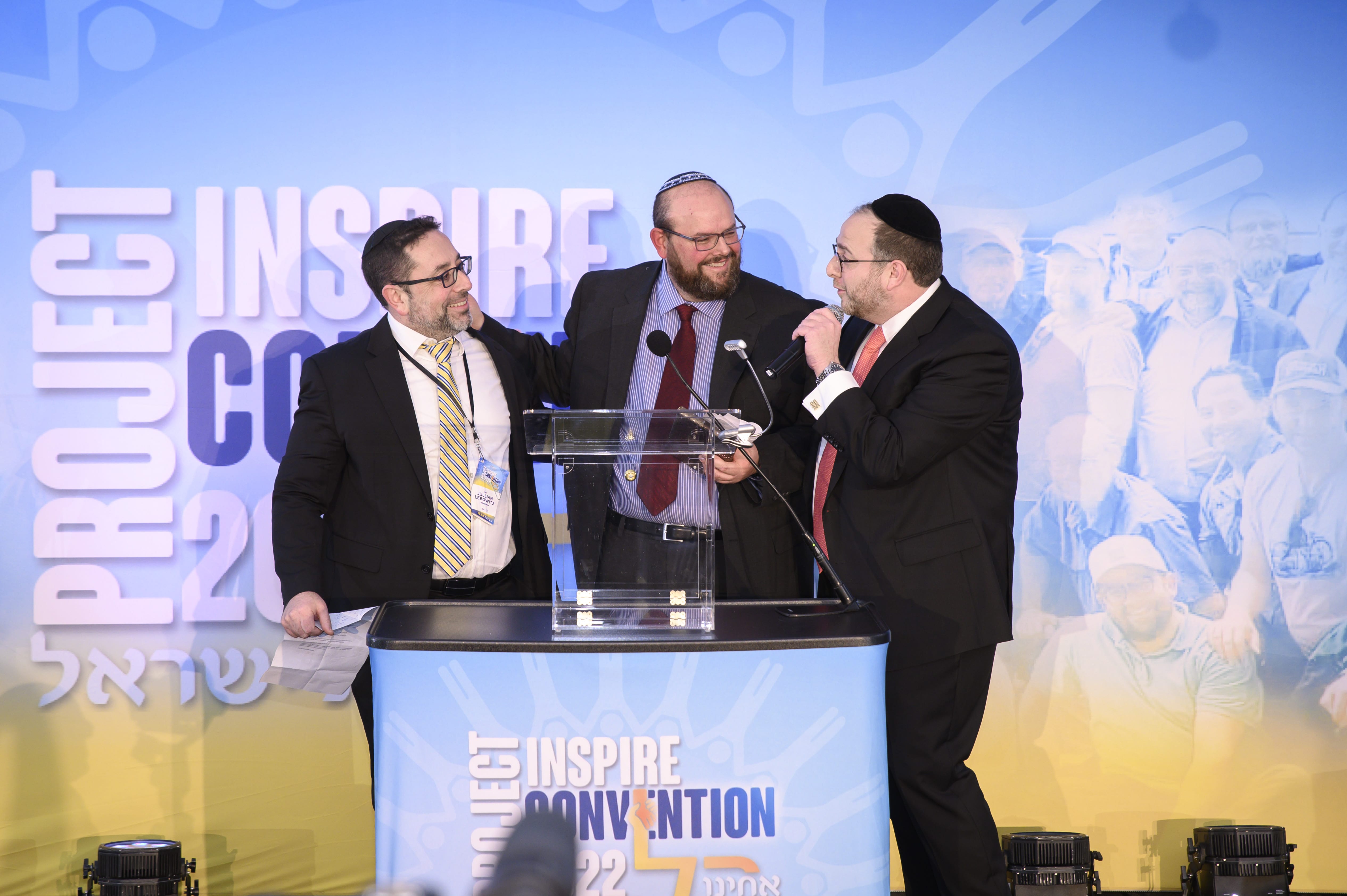 Rabbi Yitzchok Pindrus, a member of the Knesset and special guest, is presented with an award for his acts of chesed on behalf of Jewish communities around the world, and relates his close connection with the Project Inspire team.