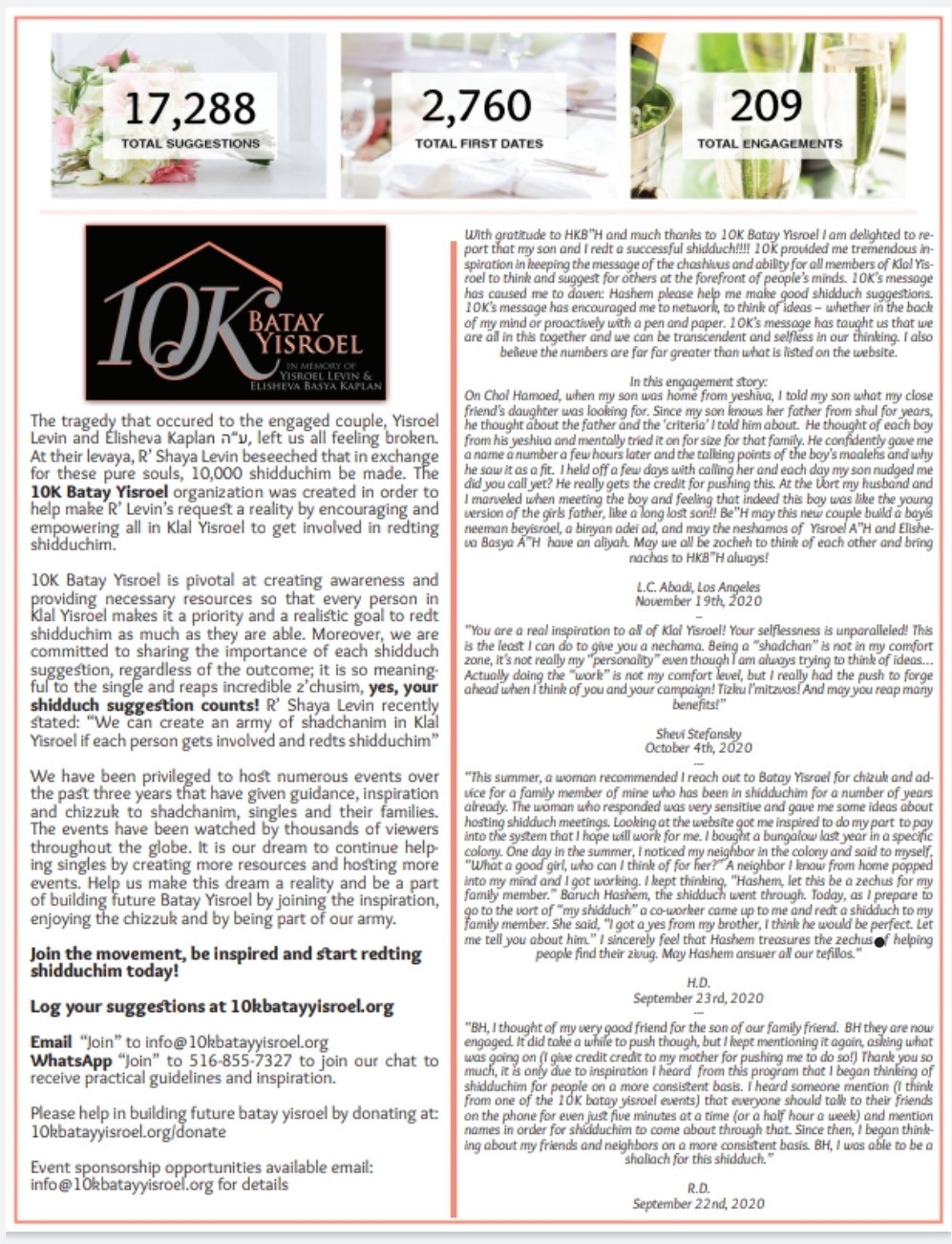 10K Batay Yisroel is a project rooted in a horrific accident and the reaction of two ordinary– yet extraordinary– families who transcended that tragedy and transformed it into an incredible organization. Yisroel Levin a”h and Elisheva Kaplan a”h, were engaged and preparing to build their own Bayis Bi’yisroel when a terrible car accident took them from us and left the world a smaller place. At their levaya, R’ Shaya Levin beseeched that in exchange for these pure souls, 10,000 shidduchim be made. 10K Batay Yisroel was then created in order to make R’ Levin’s request a reality.
