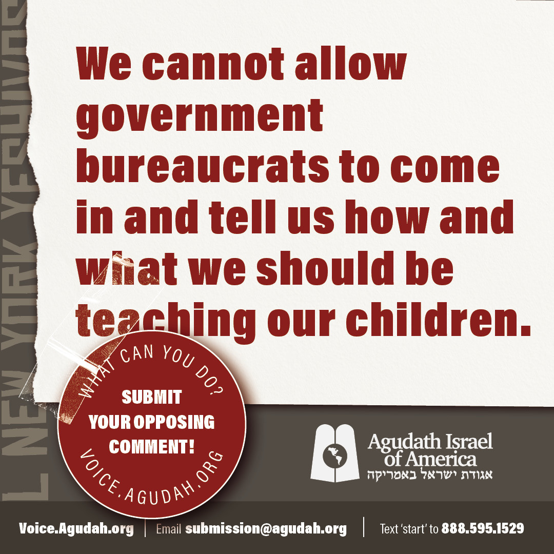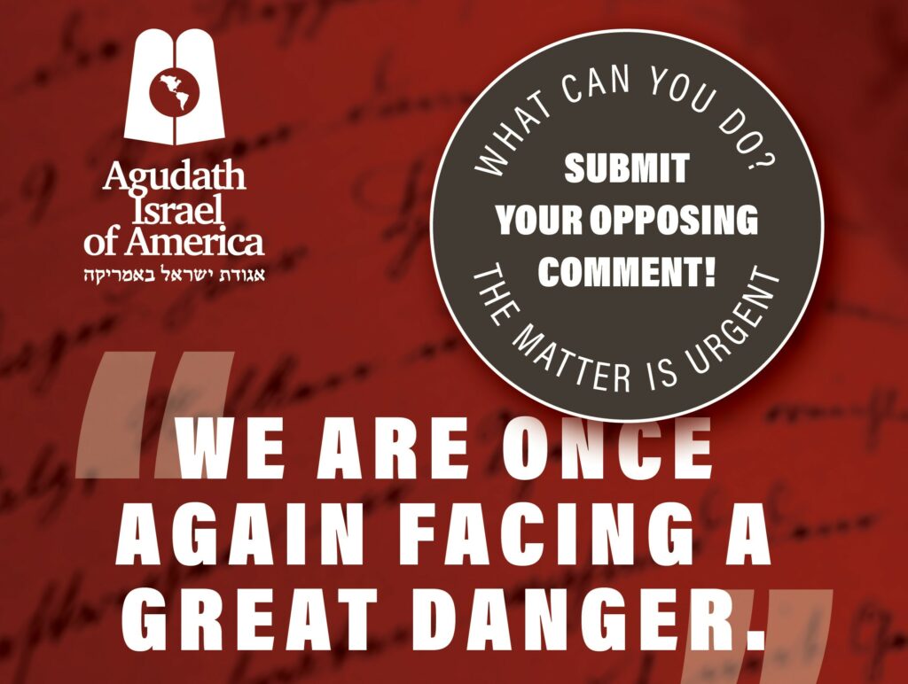 In addition, comments can be texted by texting START to 888.595.1529 or by mail to Submission, Agudath Israel of America, 42 Broadway 14th floor, NY, NY 10004. It is most effective if you submit your own, original letter.
