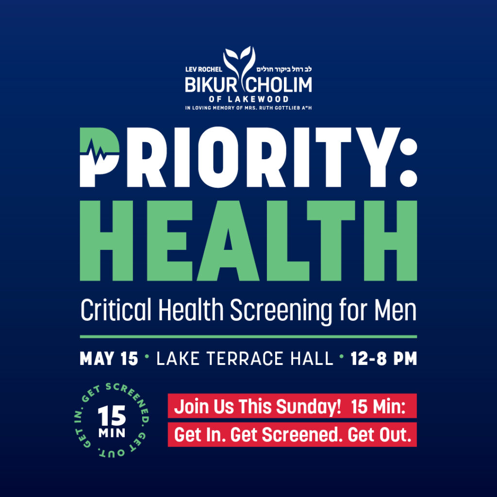 Due to a recent increase in the occurrence of sudden heart attacks and strokes in young Lakewood men in their 30s and 40s — and even their mid-high 20s — Lev Rochel Bikur Cholim is holding a critical health screening for men on Sunday May 15th from 12-8 pm in Lake Terrace Hall.