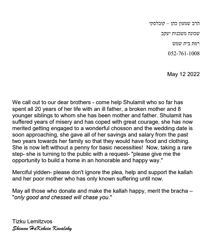 You have an incredible opportunity to invest in the great mitzva of hachnosas kallah, and you will be wiping away the bitter tears from my eyes.