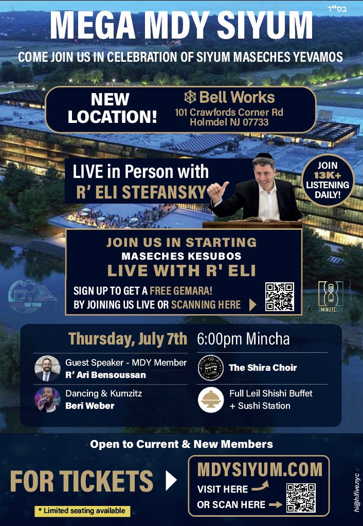 Due to increased demand for tickets, the Mega MDY (Mercaz Daf Yomi) Siyum on Yevamos Daf Yomi + Start of Maseches Kesubos has been moved to the ballroom in Bell Works, NJ