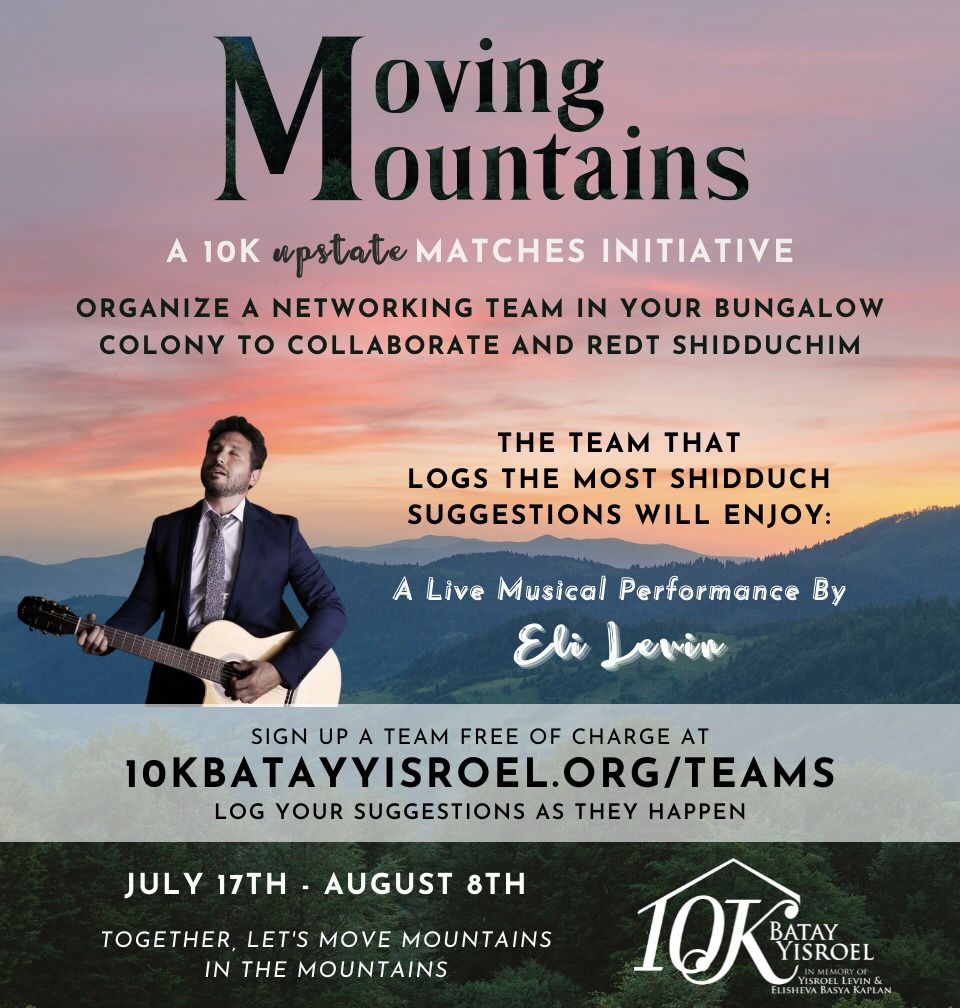 10K Batay Yisroel is running a Moving Mountains initiative where bungalow colonies are joining together as a networking team to redt shidduchim.