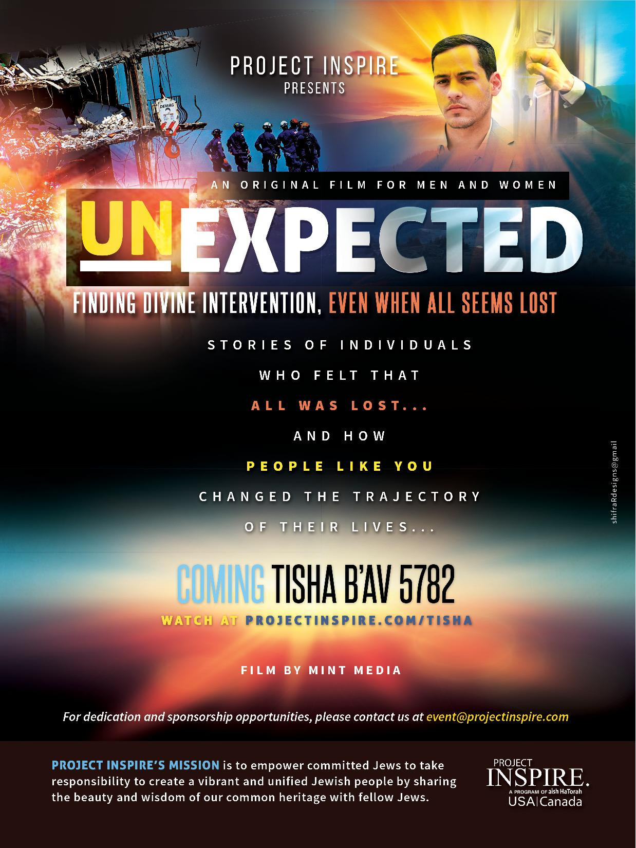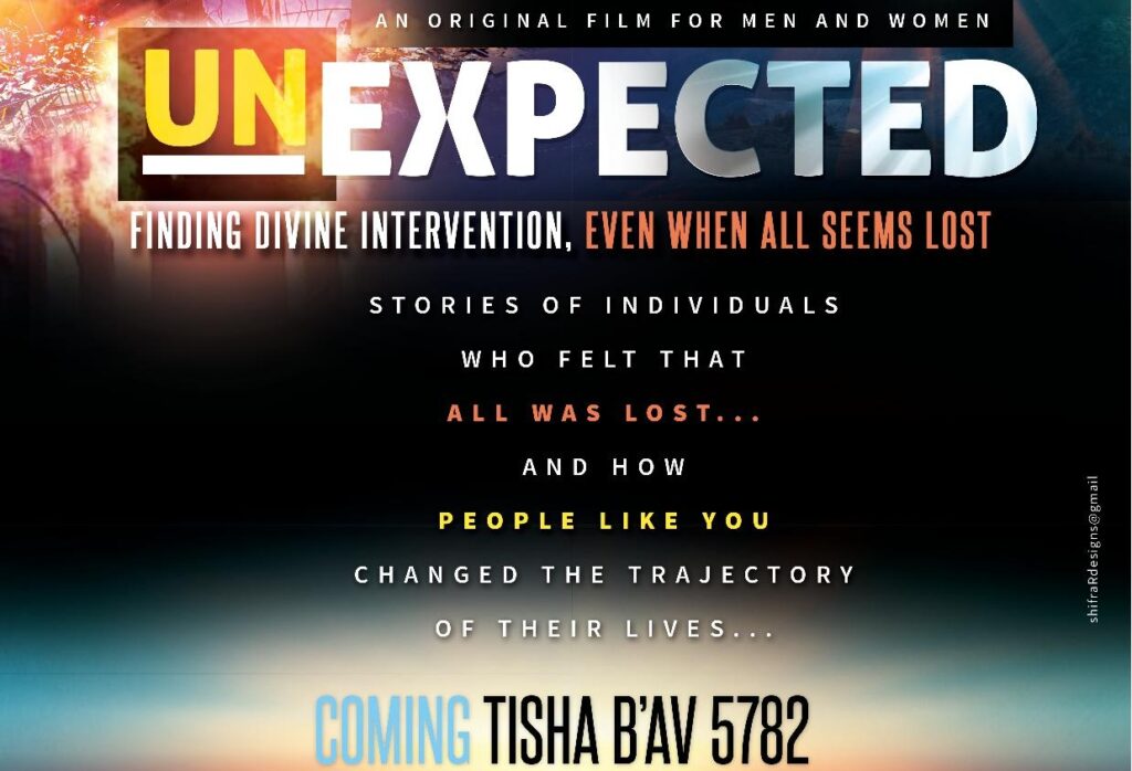 Join Project Inspire for their thirteenth annual Tisha B’av video on Sunday, August 7th, by viewing an outstanding 55-minute documentary film called “Unexpected”. The film is about individuals who could have easily fallen into the abyss of doubt and uncertainty in their times of challenge. But instead, they rose to the occasion and discovered Divine intervention when everything seemed lost.