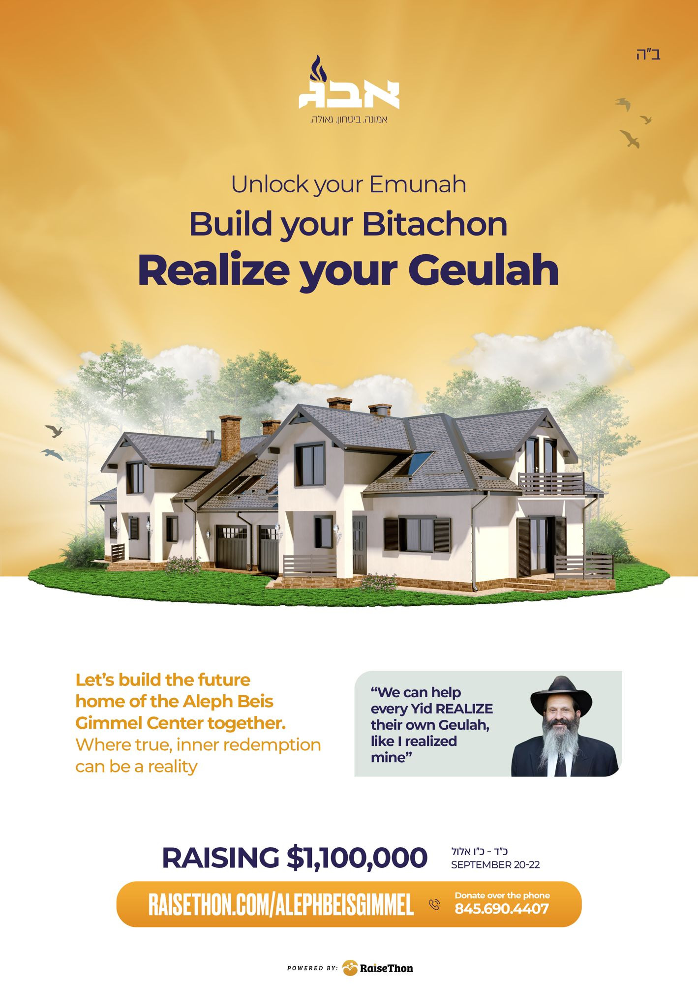 As we prepare for Rosh HaShanah and the new year ahead, I turn to you with a personal request which is also a tremendous opportunity. Be a part of this important work. Your support will help Aleph Beis Gimmel bring Emunah and Bitachon, and thereby both an inner and a literal Geulah, to so many who need it and you will surely merit the Geulah you need in your life and happy, sweet new year.