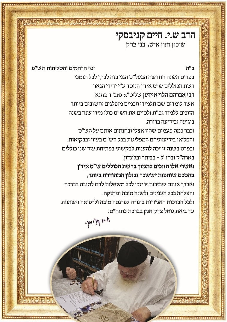As the new year approaches, and that comes upon us for the good, I extend my blessings to all those who support the Shas Yiden Kollel Network that was established by my friend and colleague Hagaon Harav Avrohom Halevi Eisen, the Pozna Rov, shlit”a. The student body comprises incredible talmidei chachomim of great stature, who are able to study and complete the entire גפ”ת (Gemora, Peirush (Rashi), Tosfos) – every year, diligently and with thorough understanding.