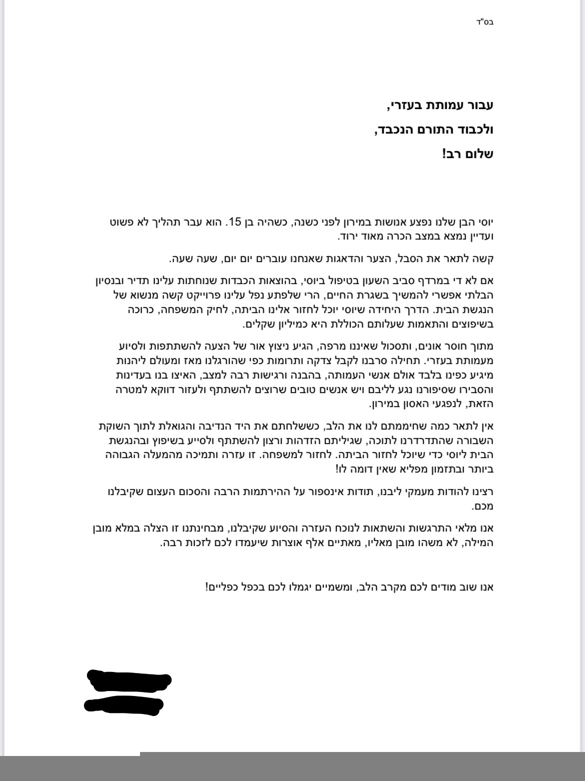 As we welcome in the New Year, American Friends of Yad Eliezer|B’ezri is extremely grateful for the zechus to serve as a source of chesed in our mission to support the Meron families. We could never have accomplished all we’ve done without the incredible support of Ralph Herzka’s Meridian Initiative, the Thank You Hashem group and our many donors. Thanks to them, we will continue to help these families rebuild their lives. Together, we will ensure that the Meron families are not – and will never be – forgotten.