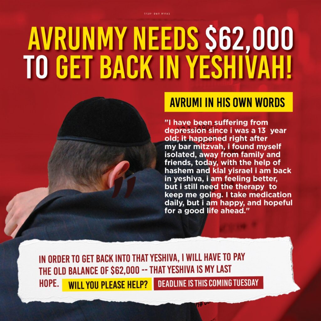 The Yeshiva starts the new winter season next Thursday, but the הנהלה notified his parents that until the balance of $62,000 isn’t paid in full, they will not be able to accept Avrumi. This money must be raised by next Thursday. Will you please help?…