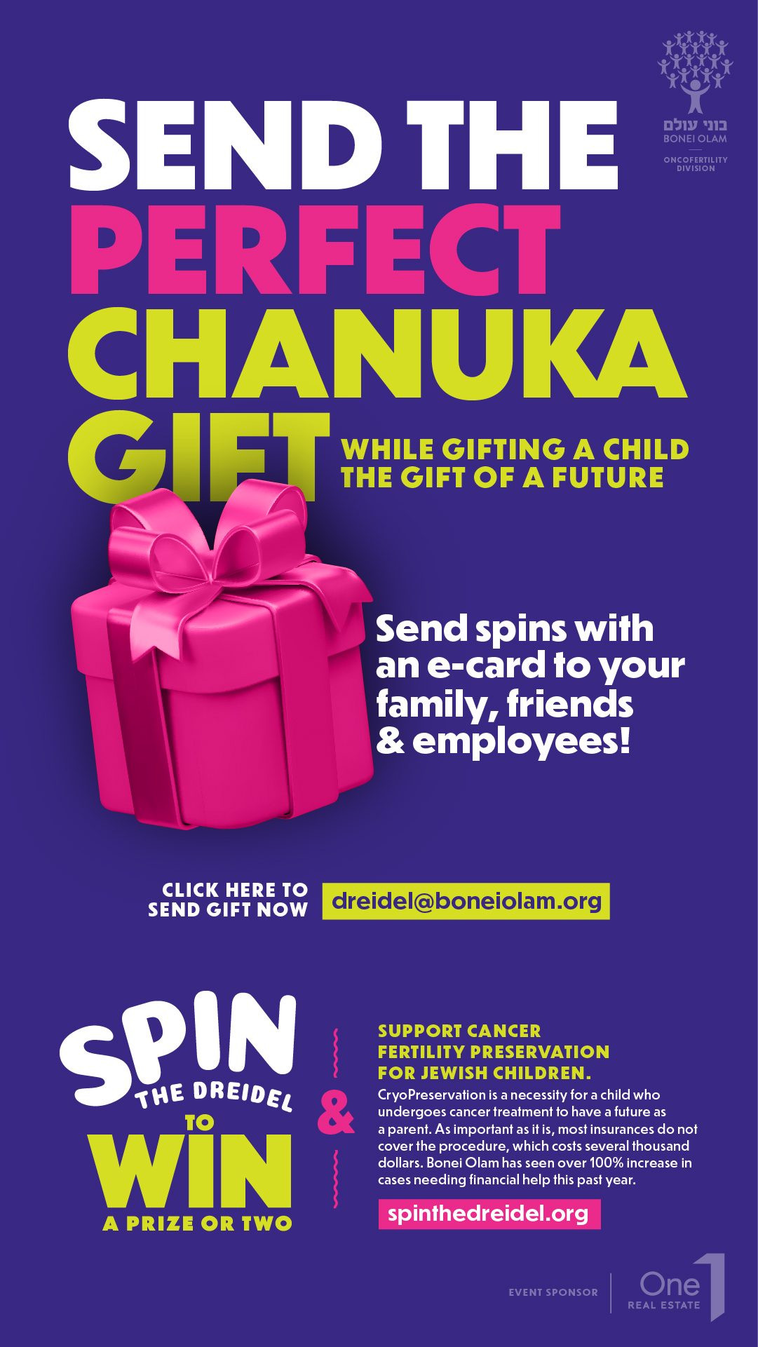 At Bonei Olam’s Dreidel4AChance, every gift is a WIN-WIN. Send spins and gift your friends and family the zchus of securing the future of a child with cancer. You will also give them a chance to win great prizes and thousands of dollars in cash.