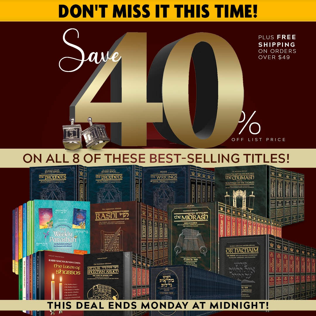 Throughout Chanukah, ArtScroll ran 8 daily specials at 40% off. Missed it this year? ArtScroll is re-running all 8 specials from Motzaei Shabbos through Monday at noon!