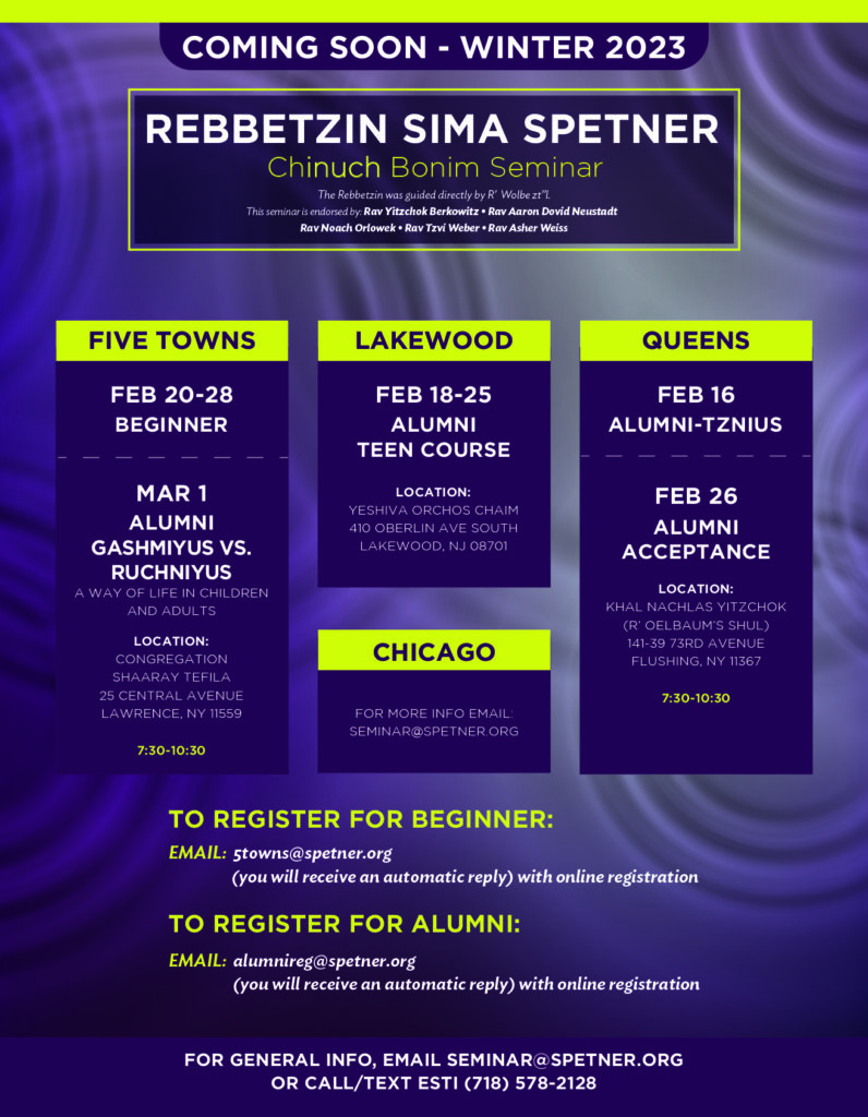 For information or to register: (call/ text) Esti Hirshfeld – 718-578-2128