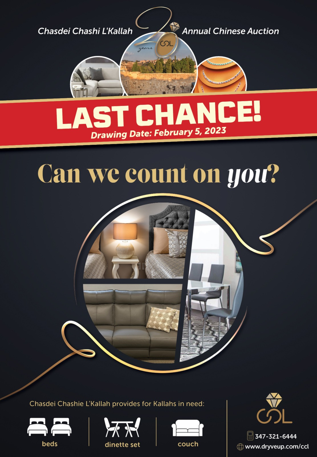 Your contribution to Chasdei Chashie L’Kallah goes a long way in helping establish another Bayis Neeman B’Yisroel. Now more than ever, Chasdei Chashie is being inundated with calls, in fact in the last 6 weeks CCL has received 115 requests. We need your help to enable them to respond to the staggering amount of requests. Feel the pain of these needy families, be truly nosei b’ol chaveircha, and join this special organization in their upcoming Chinese Auction.