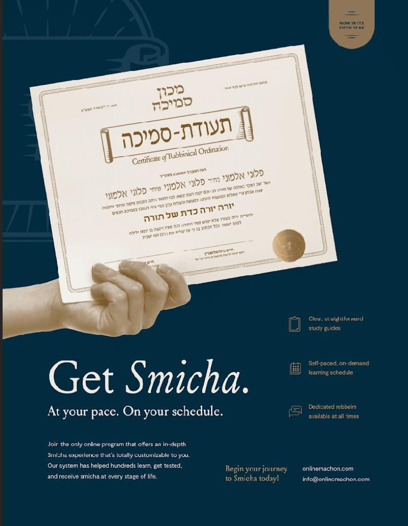 Machon Smicha’s next smicha cohort begins on 1 March 2023 (8 Adar 5783). To learn more, or to register, visit onlinemachon.com/smicha.