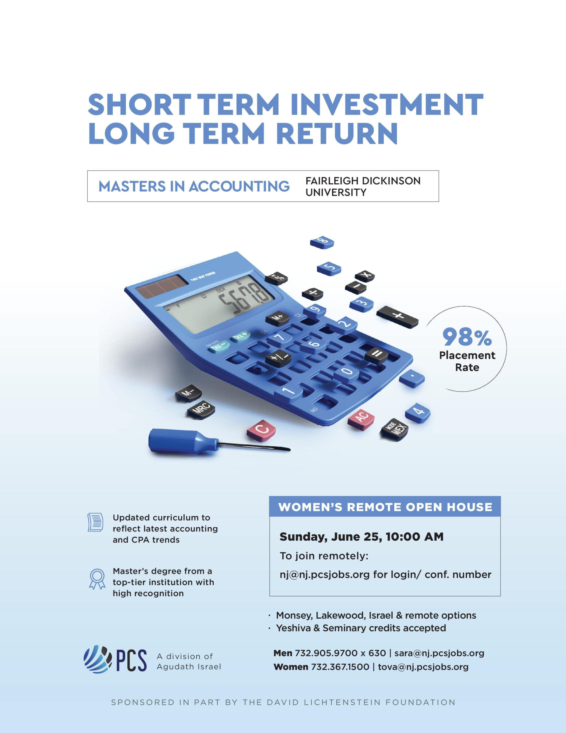 After the resounding success of its previous classes, PCS (A project of Agudath Israel) is launching the next cohort of its acclaimed M.S. Accounting program, in conjunction with FDU. The 15 month program begins October 2023. Classes are held 1-2 evenings a week and on Sundays. There are loans for eligible students and dedicated on staff recruiters with a decade of relationships with many large Accounting firms. For more information contact: Tova Sapirman at 732-367-1500 or [email protected]