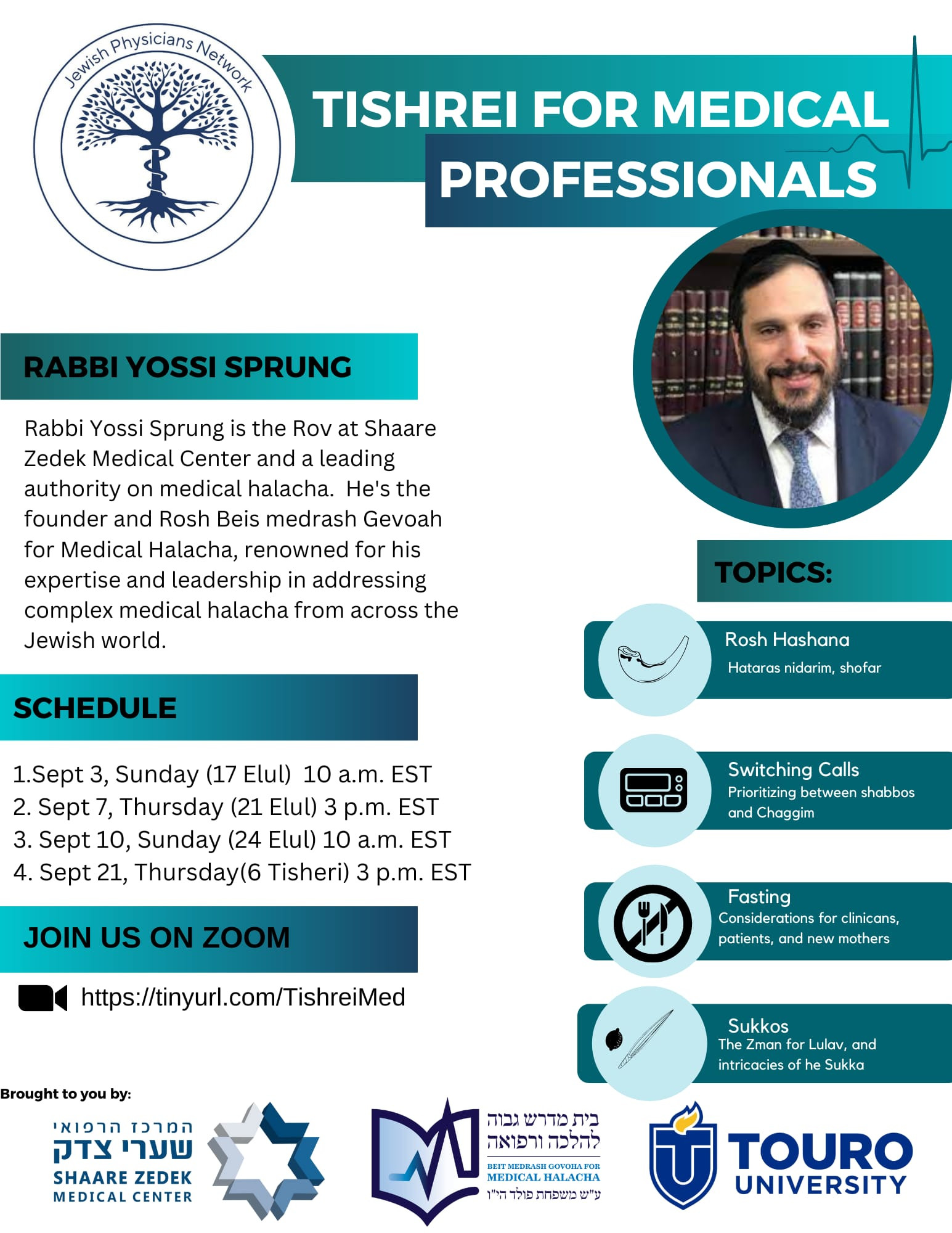 Tishrei for Medical Professionals –A Special Series co-sponsored by by Shaarei Zedek Medical Center, Beis Medrash Govoha for Medical Halacha and Touro University.
