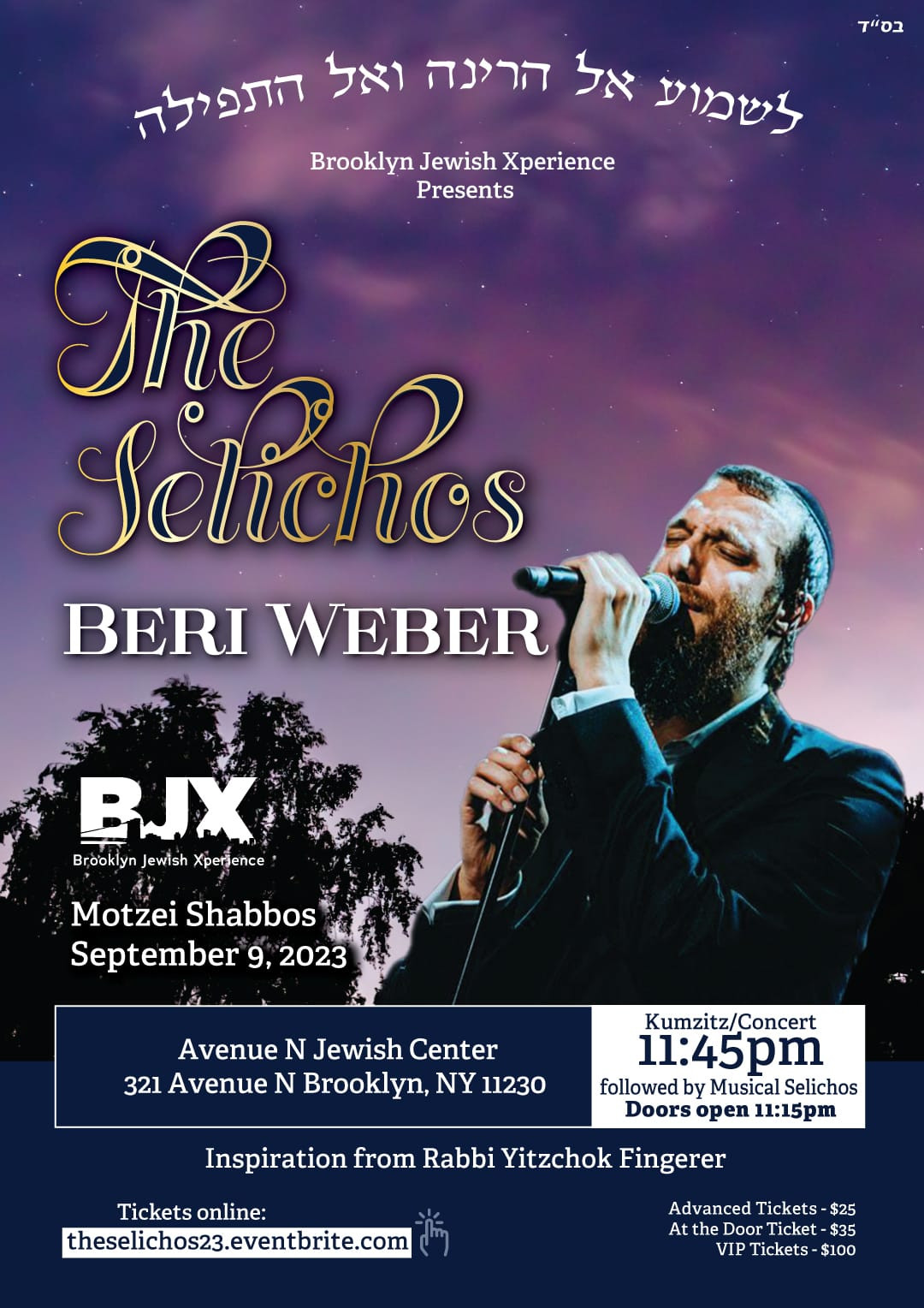 Join The Selichos with Beri Weber, this Motzei Shabbos, September 9, for the most inspirational Selichos. Get into the proper frame of mind for an uplifting Yomim Noraim. Don’t miss this event! Click here for Tickets