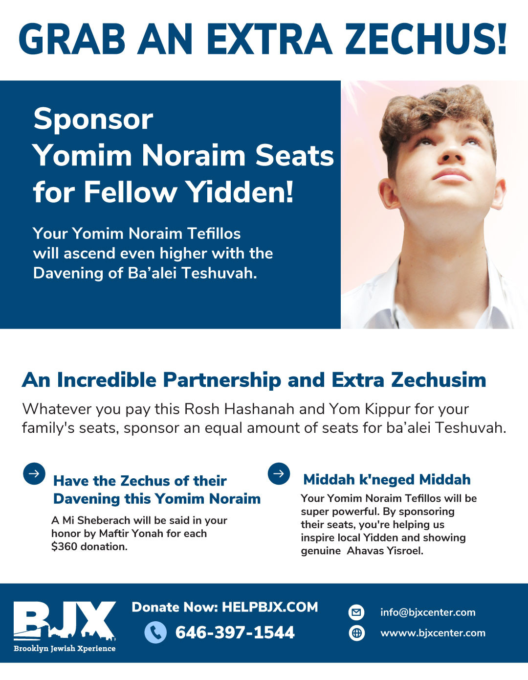 Grab an extra Zechus this year! Whatever you pay for your family’s seats for Yomim Noraim, sponsor an equal amount of seats for Balei Teshuvah. Your Teffilos together with the Teffilos of sincere Balei Teshuva will be super powerful in Shaymayim. Have the Zechus of their daveing this Yomim Noraim. Your own Teffilos will ascend to the highest heavens, Middah k’Neged Middah. By sponsoring their seats, you’re helping us inspire local Yidden and sharing genuine Ahavas Yisroel.