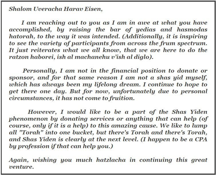 We recently received the following letter that confirms the impact of Shas Yiden and its brocho on the Klal, and which I wanted to share with you.
