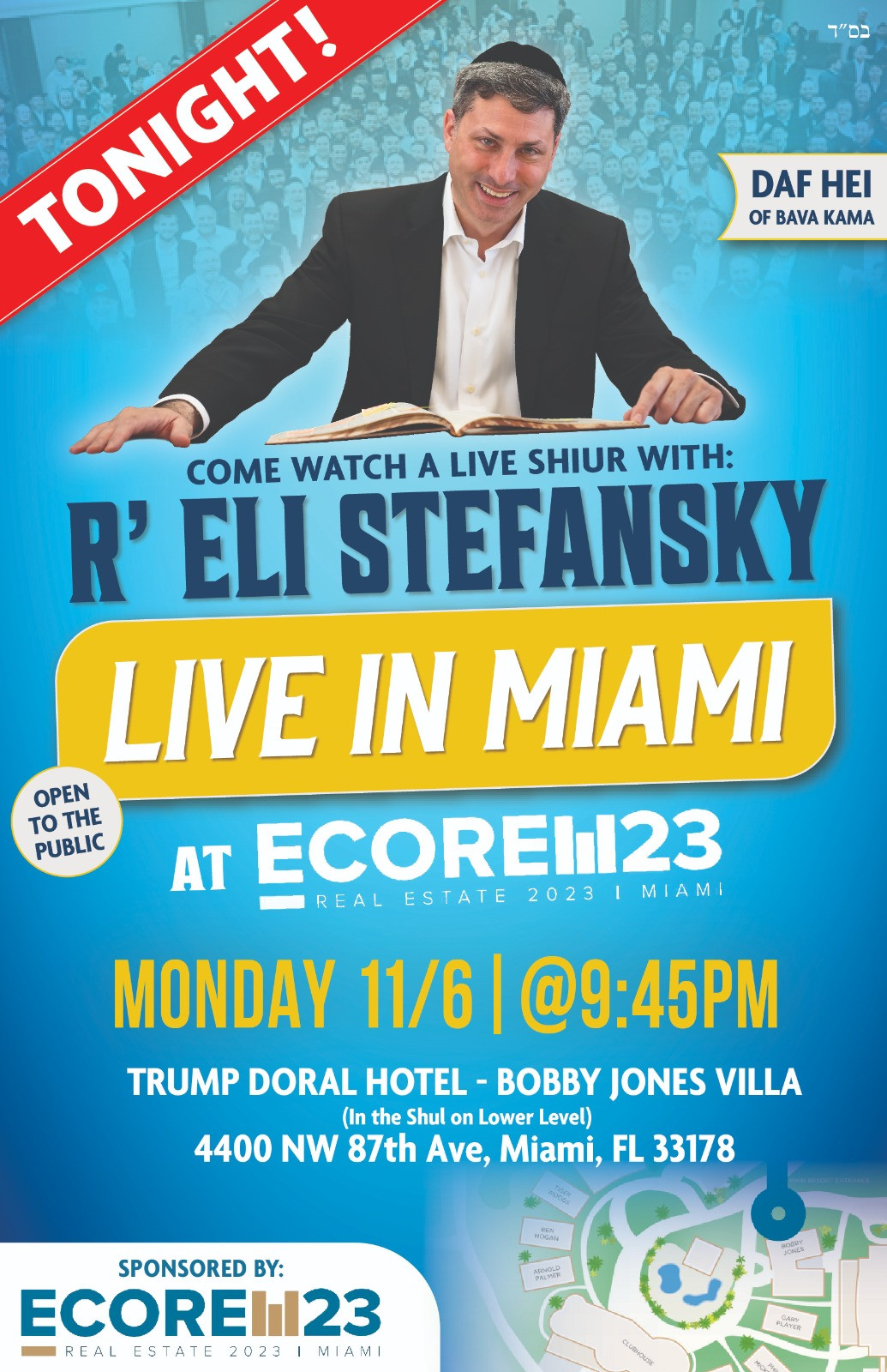 Famed Daf Yomi Maggid Shiur Reb Eli Stefansky will be giving shiur (Bava Kama Daf Hei) LIVE tonight from Miami at Ecore-23.