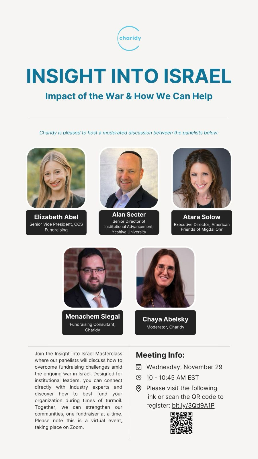 Rising to address concern and dispel confusion in the art of wartime fundraising, Charidy brings a unique panel of experts together to share invaluable information in tomorrow’s webinar. Elizabeth Abel, Senior VP of CCS Fundraising; Alan Secter, Senior Director of Institutional Advancement at Yeshiva University; Atera Solow, Executive Director of American Friends of Migdal Ohr; and Senior Fundraising Specialist Menachem Siegal of Charidy will offer insights into the shifting landscape of fundraising. Moderator Chaya Abelsky, Charidy Senior Campaign Manager, joins her fellow experts in this authoritative discussion of successful fundraising, perseverance, and growth in the face of uncertainty.