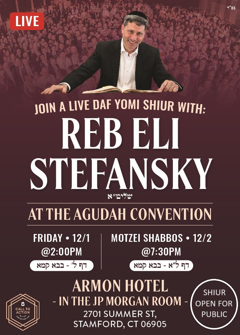 Famed Maggid Shiur Reb Eli Stefansky shlit”a will be giving two LIVE Daf Yomi shiurim at the Agudah Convention this Friday and Motzei Shabbos.