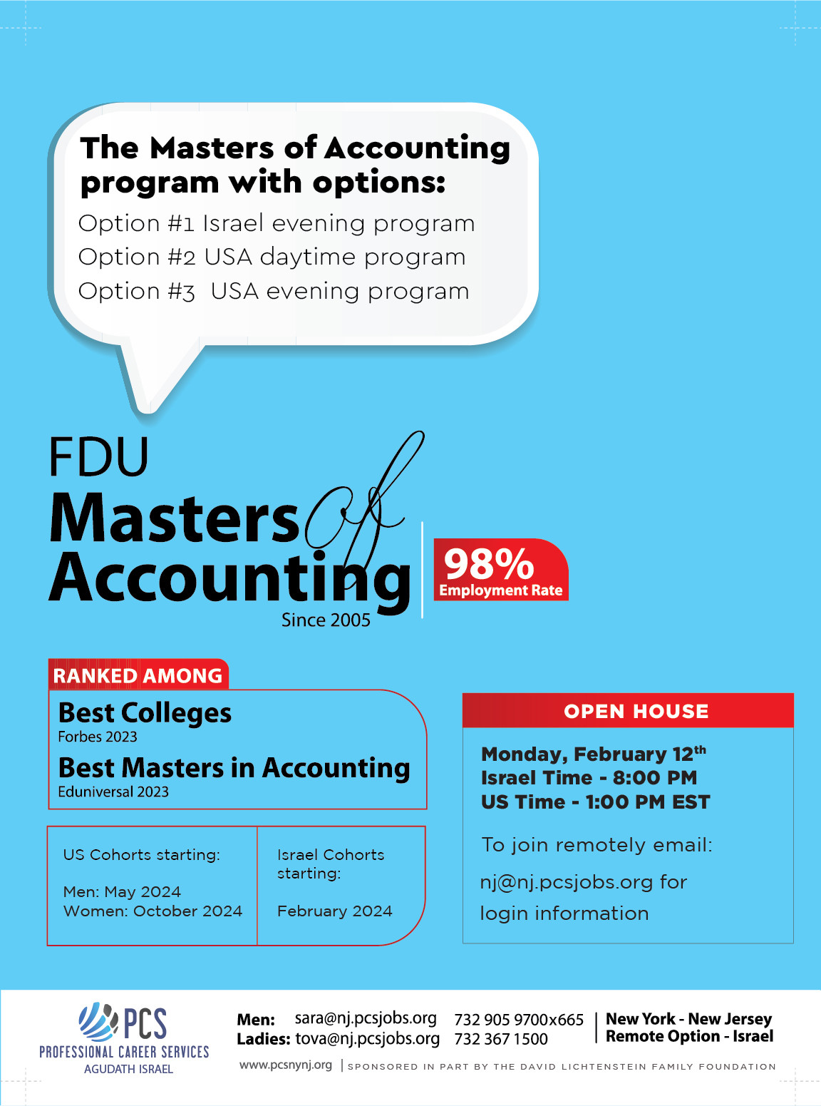 PCS/ FDU Accounting Course Open House Monday, February 12th at 8:00 PM Israel Time (1pm EST)