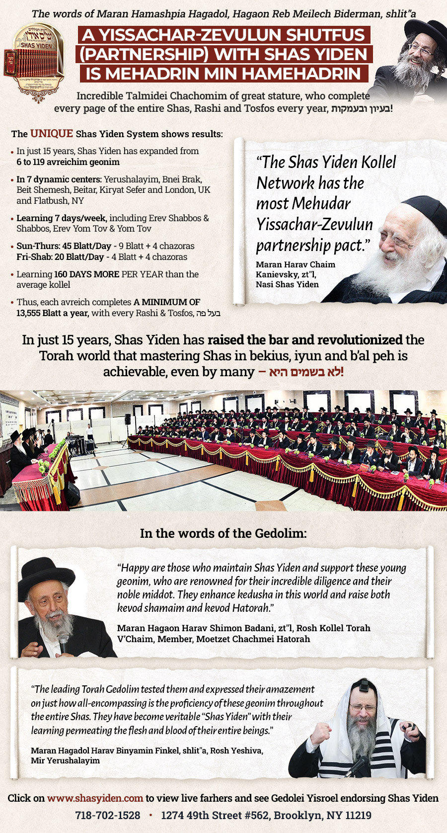 The Halacha – The Shulchan Aruch in Yoreh De’ah #246 addresses the efficacy of a Yissachar-Zevulun Pact and states: It is considered as if the one supporting the learning learned all the Torah himself. Thus, those who support the Talmidei Chachomim at Shas Yiden, merit a portion in the annual 570,000 daf of Talmud Bavli that they study – a portion both in this world and the next!