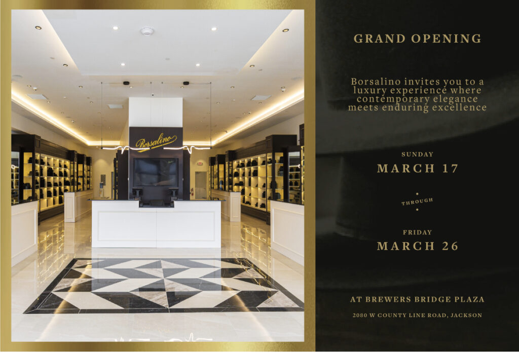 Step into our new Borsalino Lakewood store, offering a wide array of hat styles for every taste.