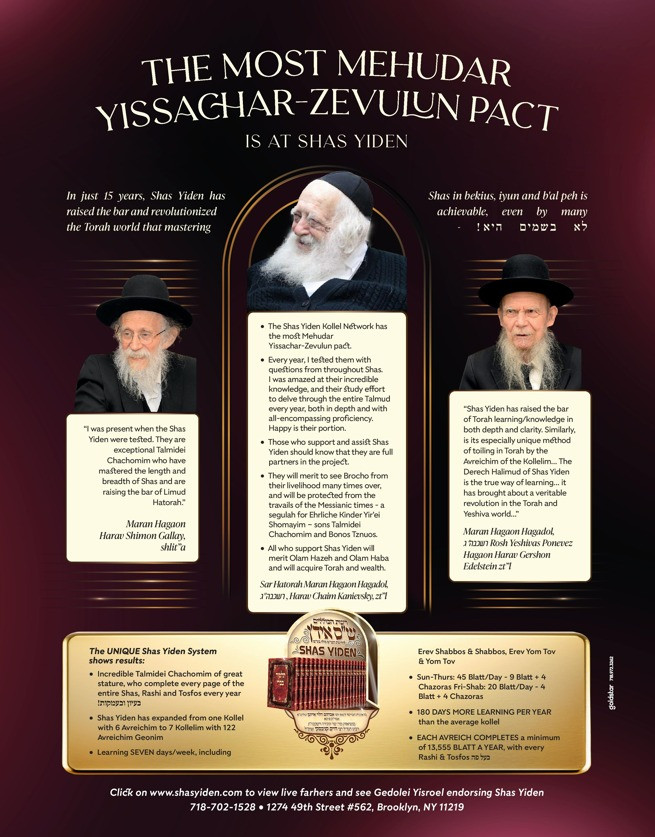 This elevated level of Torah study at Shas Yiden and the ability of the avreichim geonim to face public oral farheren by world recognized Gedolei Torah, together with monthly tests on 225 blatt, is nothing short of remarkable. Shas Yiden has truly raised the bar in the study of Shas. Our unique system of learning, the tight demanding regimen and the motivation emanating from Eretz Yisroel has truly placed Shas Yiden in a Torah league of its own.