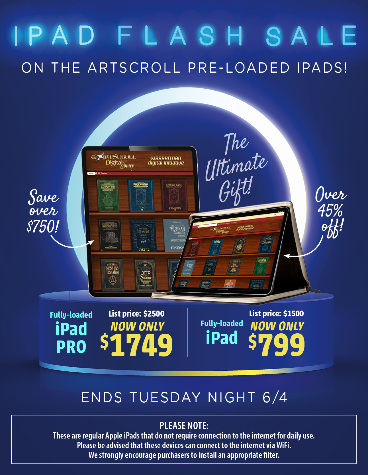 This weekend only, save $700 on ArtScroll’s pre-loaded iPad, containing the entire ArtScroll digital library of 461 classics that include Chumash, Siddur, Tanach, Talmud, Mishnah, Rashi and much more, all in the palm of your hands!
