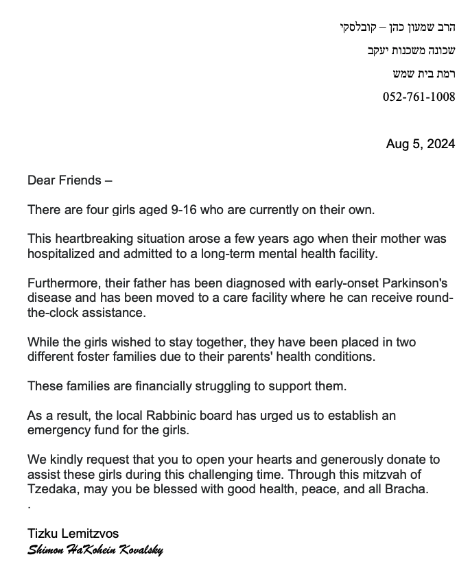 While the girls wished to stay together, they have been placed in two different foster families due to their parents’ health conditions. These families are financially struggling to support them. As a result, the local Rabbinic board has urged us to establish an emergency fund for the girls. CLICK HERE TO DONATE