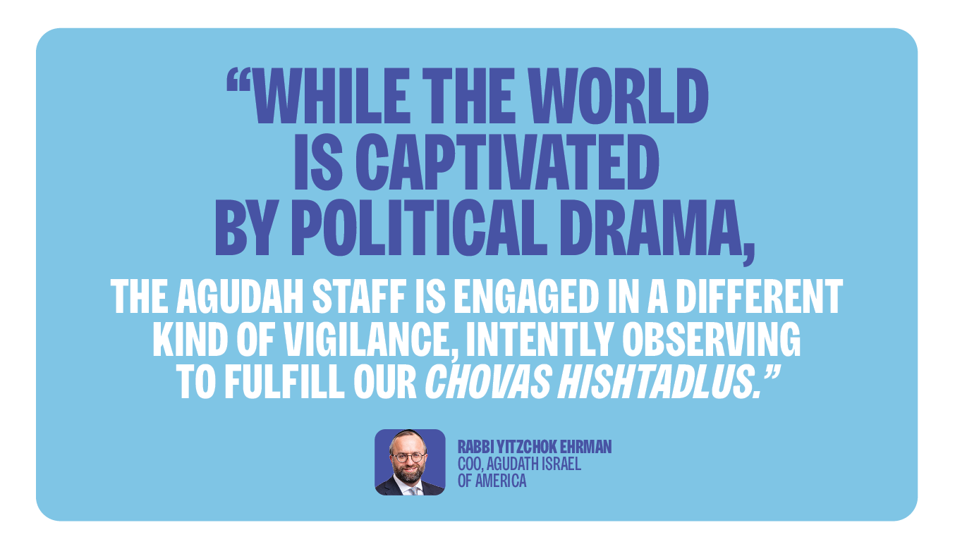While the world is captivated by political drama, the Agudah staff is engaged in a different kind of vigilance, intently observing to fulfill our chovas hishtadlus—our duty to engage in proactive efforts on behalf of Klal Yisroel. We are not merely observers, but active participants, ensuring that our shtadlanus serves the greater good of Klal Yisroel and is mekadeish Sheim Shamayim.