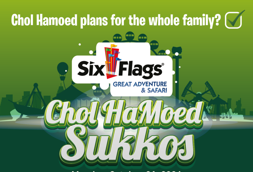 NCSY is taking over Six Flags Great Adventure for one day only on Chol Hamoed Sukkos Monday October 21st! With rides and attractions for the whole family, Six Flags Great Adventure is the perfect chol hamoed outing. Tickets start at $25 for Safari and $55 for theme park in presale, and tickets can be purchased at the gate as well. Parking passes are also available for purchase. Kosher food under the hashgacha of the OU, will be available for purchase and a sukkah will be available on premises. Take advantage of shorter lines a heimish environment and join NCSY at Six Flags Great Adventure this Chol Hamoed!