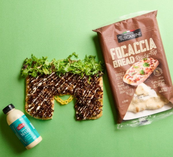 5. Place focaccia on a wooden board. Drizzle garlic mayo.