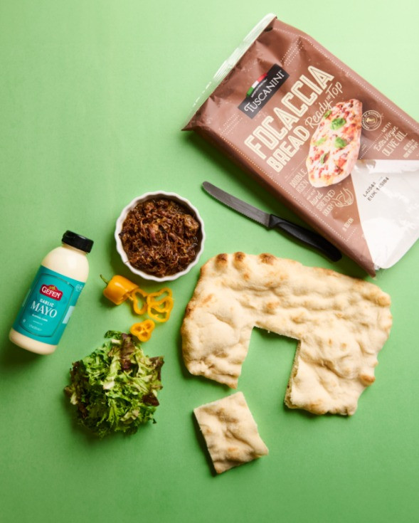 This Pulled Beef Sukkah Focaccia is simple, adorable, delicious, and kid-friendly! You can easily adapt this idea with any type of meat or even make it a dairy pizza instead. Try cutting the focaccia into 6 squares for adorable individual Sukkahs too!