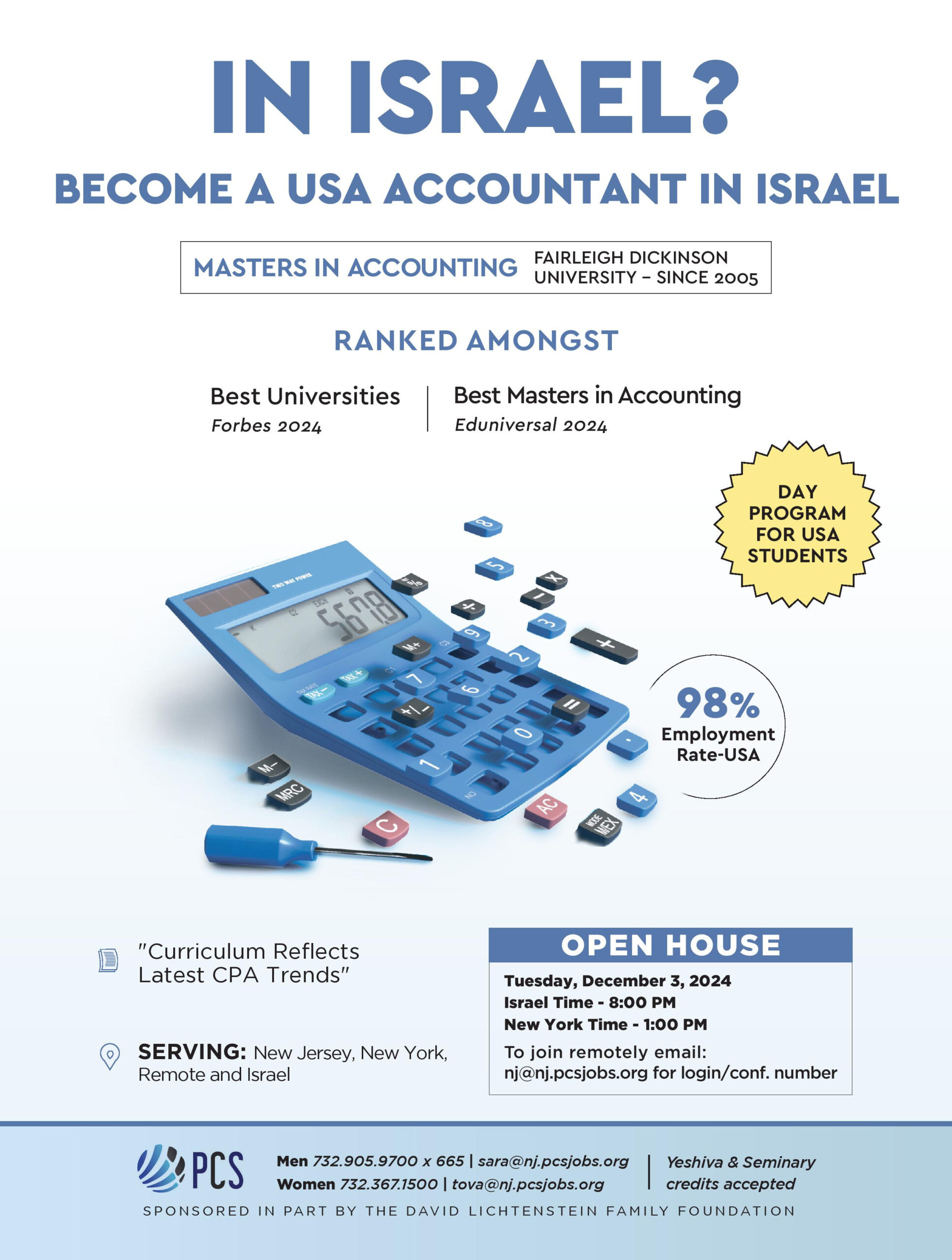 Are you ready to step into a lucrative, stable career? The PCS/FDU Masters in Accounting program offers you the opportunity to earn a world-class degree while living in Israel.