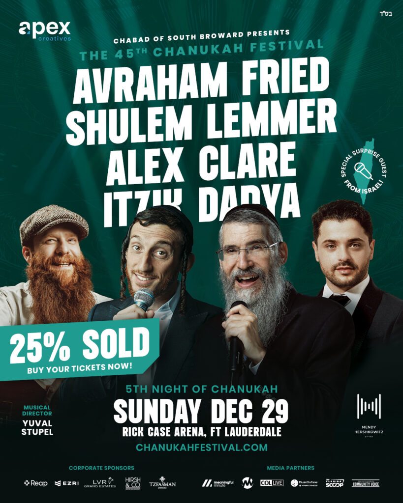 “This is not just a concert; it’s a moment to come together and feel the power of music and tradition as we celebrate the light of Chanukah,” said Rabbi Raphael Tennenhaus of Chabad of South Broward. “With such an extraordinary lineup, it’s sure to be an experience that will leave everyone inspired.”
