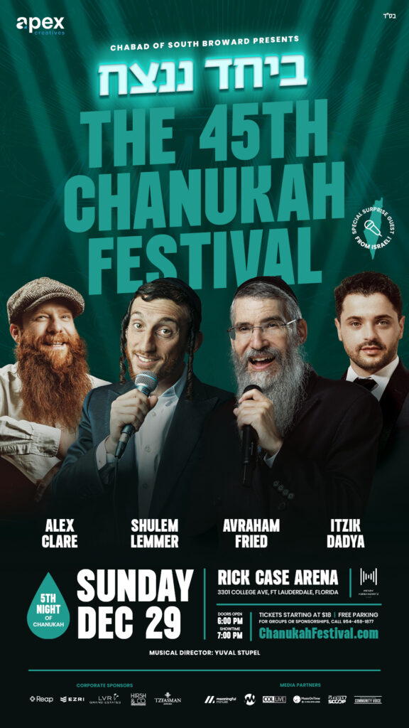 The highly anticipated 45th Annual South Florida Chanukah Festival is set to take place on Sunday, December 29, 2024, promising an unforgettable evening of music and celebration. This year’s festival, hosted by Chabad of South Broward, is already shaping up to be a global event, with ticket sales coming in from across the world.