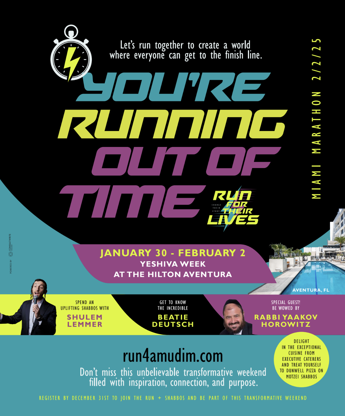 The Run begins with an incredible and transformative Shabbos experience, hosted at the Hilton Aventura in Florida. Rabbi Yaakov Horowitz will be joining for the Shabbos, as well as Beatie Deutsch and Shulem Lemmer. Exceptional cuisine provided by Executive Caterers and Dunwell Pizza.