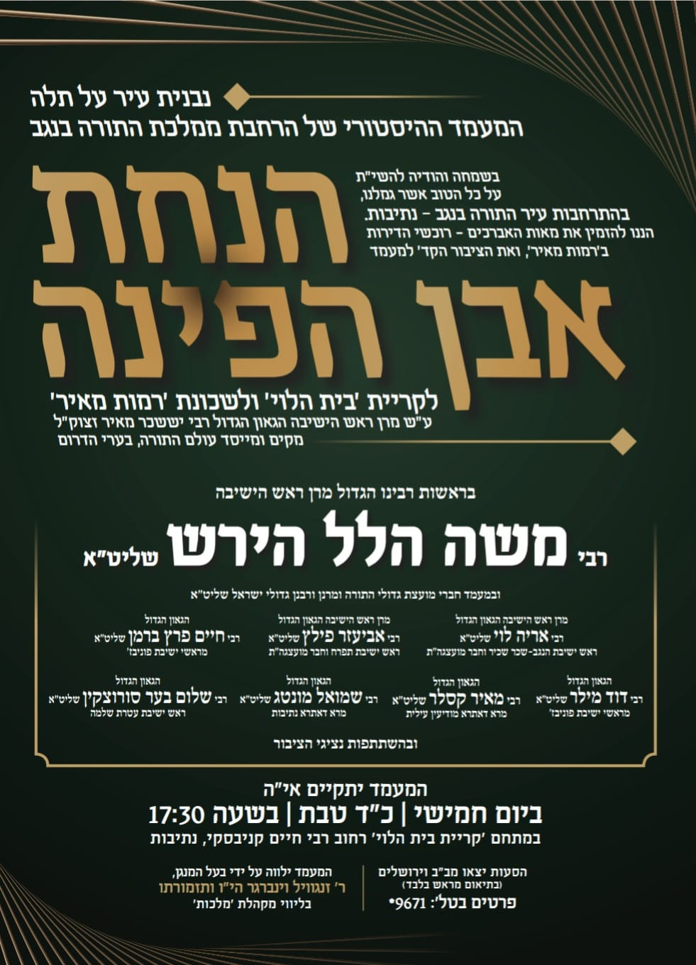 A historic milestone will be celebrated on Thursday of this week with the founding of Kiryat Beit Halevi and the expansion of Netivot, the city of Torah in the Negev, transforming Netivot into the next Haredi city of the future. In attendance will be hundreds of families who have purchased apartments in Ramot Meir and Kiryat Beit Halevi. They will participate in laying the cornerstone of this new neighborhood, led by Maran, Rosh HaYeshiva HaGaon Rabbi Moshe Hillel Hirsch, shlita and Members of the Council of Torah Sages, shlita.