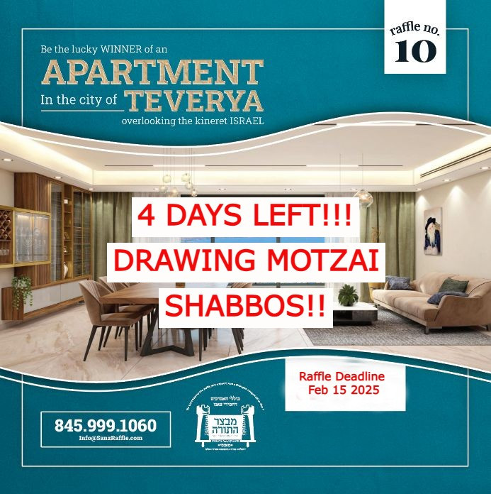 4 Days Left! Win This Motzei Shabbos Apartment in ISRAEL! Only $100!!