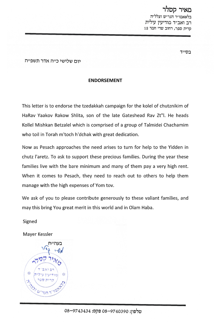 We plead to you, dear friends and klal yisroel. Please open your hearts and give a generous contribution to our Kollel Mishkan Betzalel Kimcha D’pischa fund. This way these brave/valiant Kollel families can come to the Pesach Seder feeling the joy and the royalty of the Seder night.
