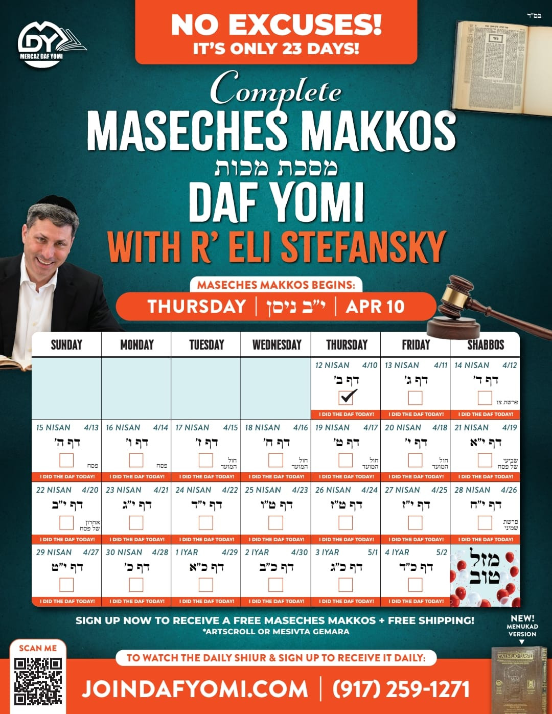 For the very first time, Artscroll is producing Menukad Gemaras for Daf Yomi Maseches Maakos. You can get your copy for absolutely free! All you have to do is to try Reb Eli Stefansky’s energetic and exciting Daf Yomi Shiur and you get your gemara delivered to your door. Maakos is only 23 days, get it done!