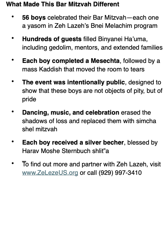 Under the leadership of Rebbetzin Rothenberg—wife of Harav Naftali Hersh Rothenberg and daughter of the Toldos Aharon Rebbe zy”a, Zeh Lazeh has become a national lifeline for widows and orphans across Eretz Yisrael. Its signature Bnei Melachim program pairs these yesomim with hand-picked yungerleit who learn with them, mentor them, and often become their closest role models.