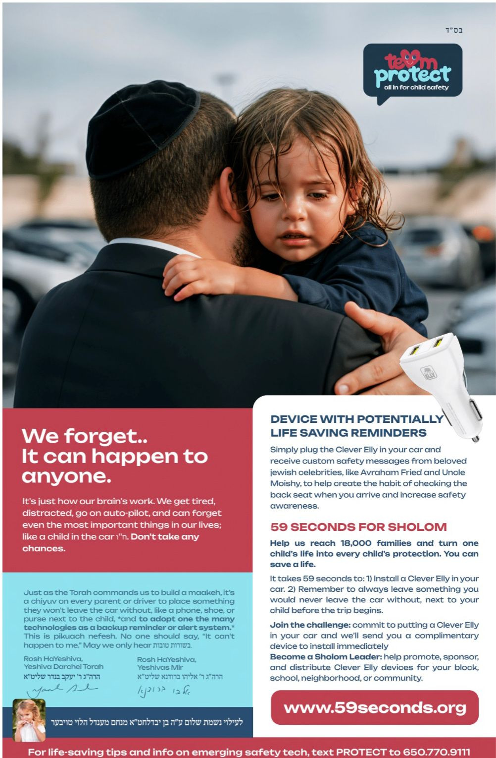 At the heart of this campaign is a simple yet potentially life-saving device called Clever Elly. This small gadget plugs into your car, charges your phone, and provides an audio reminder to check the back seat every time you turn off the engine. The custom-ordered devices for this campaign feature the voices of Jewish singers, friendly children’s voices, and other safety messages specifically designed to resonate with our community.