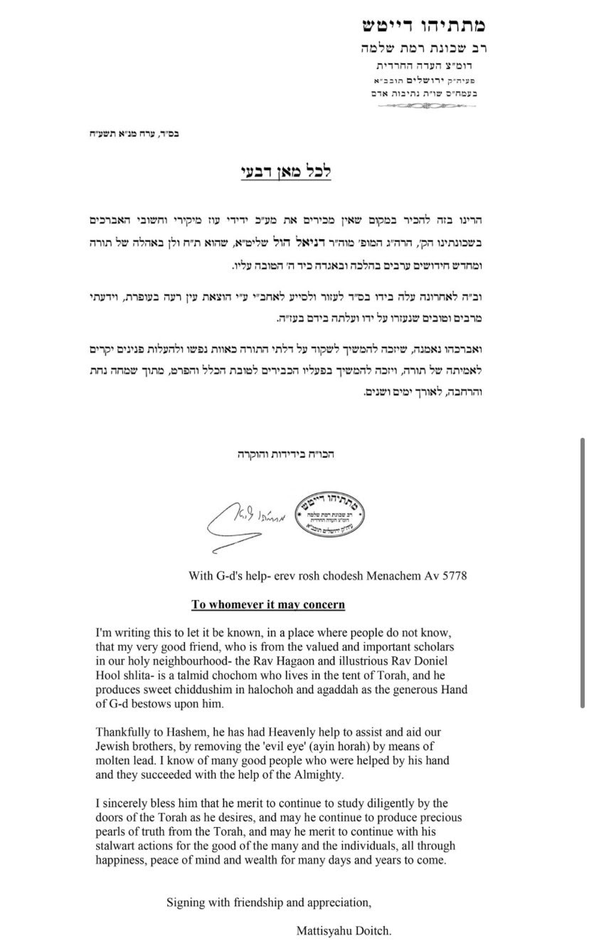 It is no small matter that a prominent rav has given his full endorsement! Here is the written endorsement he has from Hagaon Rav Mattisyahu Doitch Shlita Dayan of the Badatz eidah Chareides and Moreh D’asrah of Ramat Shlomo.