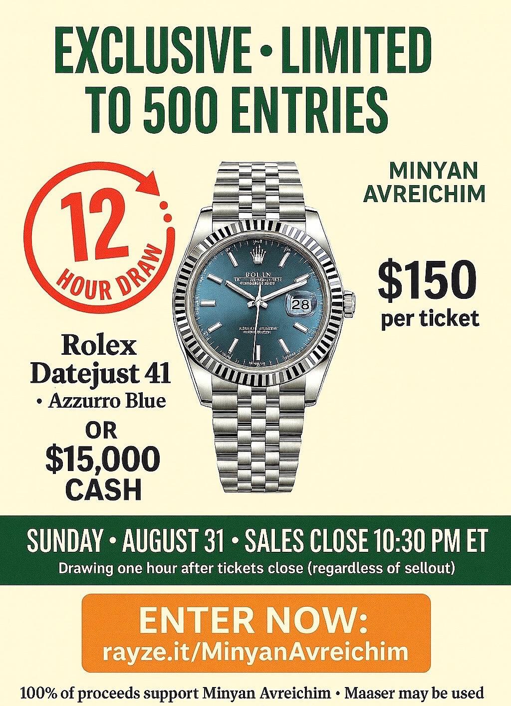 The prize: a Rolex Datejust 41 in Azzurro Blue or a $15,000 cash payout. Sales close TODAY–