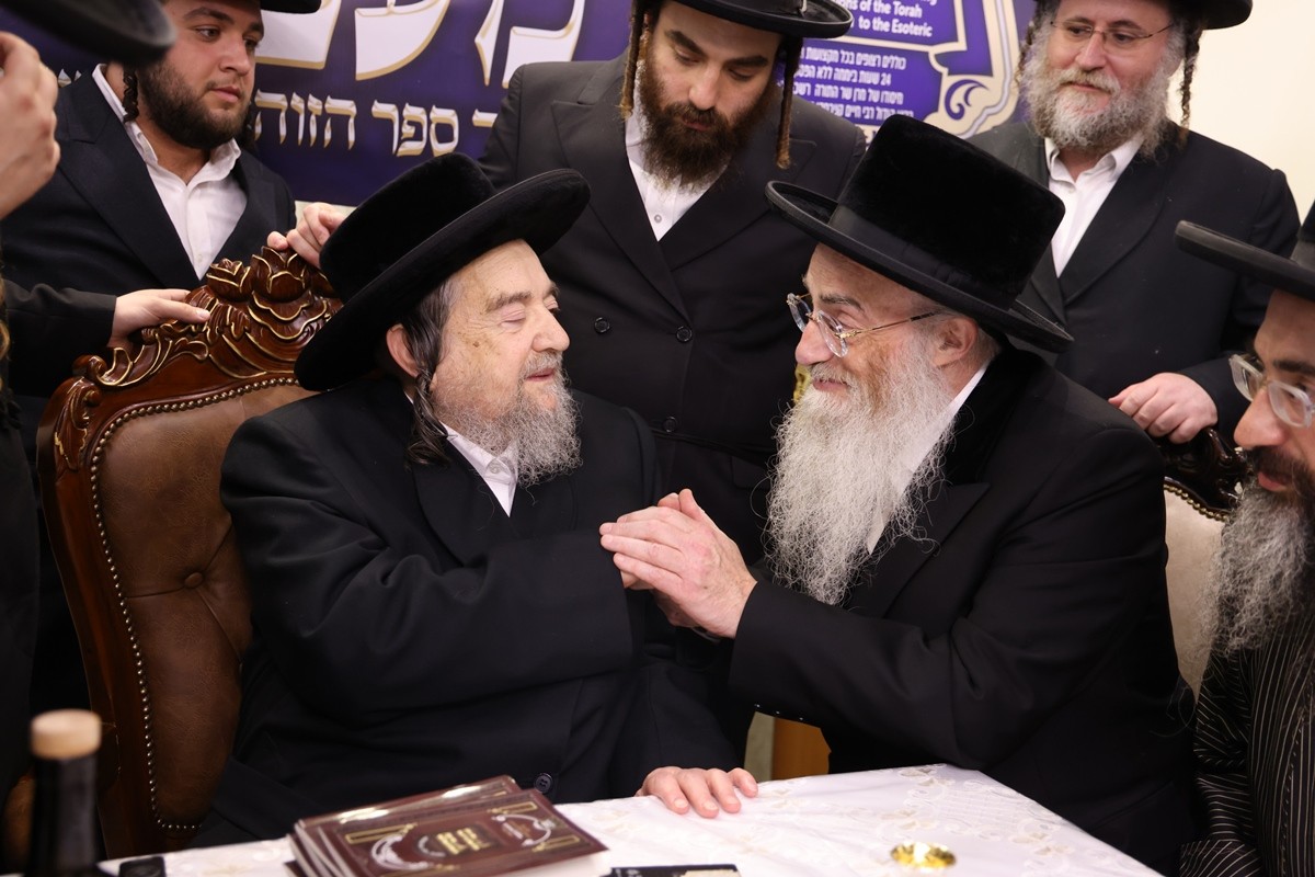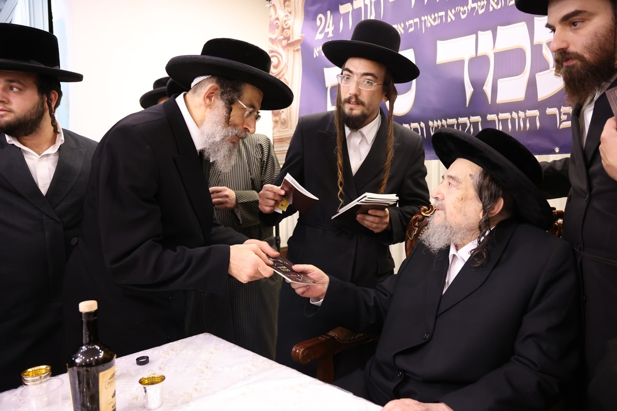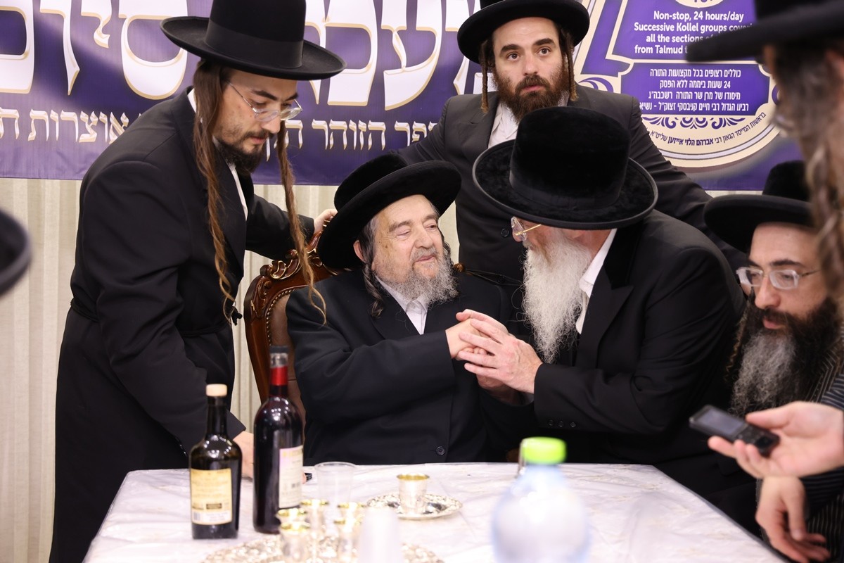 Harav Avraham Rabinowitz, son-in-law of the Toldos Aharon Rebbe, spoke, and was followed by Harav Tzvi Vigder who recited the siyum of the Otzros Chaim. The Kaddish was recited by Hagaon Harav Yosef Samet, chief editor of Oz V’hadar edition of the Talmud, who is also a member of the Kolel Kabbolah Chatzos. The gathering concluded with a l’chaim and brocha from Rav Schechter, a nigun in which all joined, and danced for kovod Hatorah.