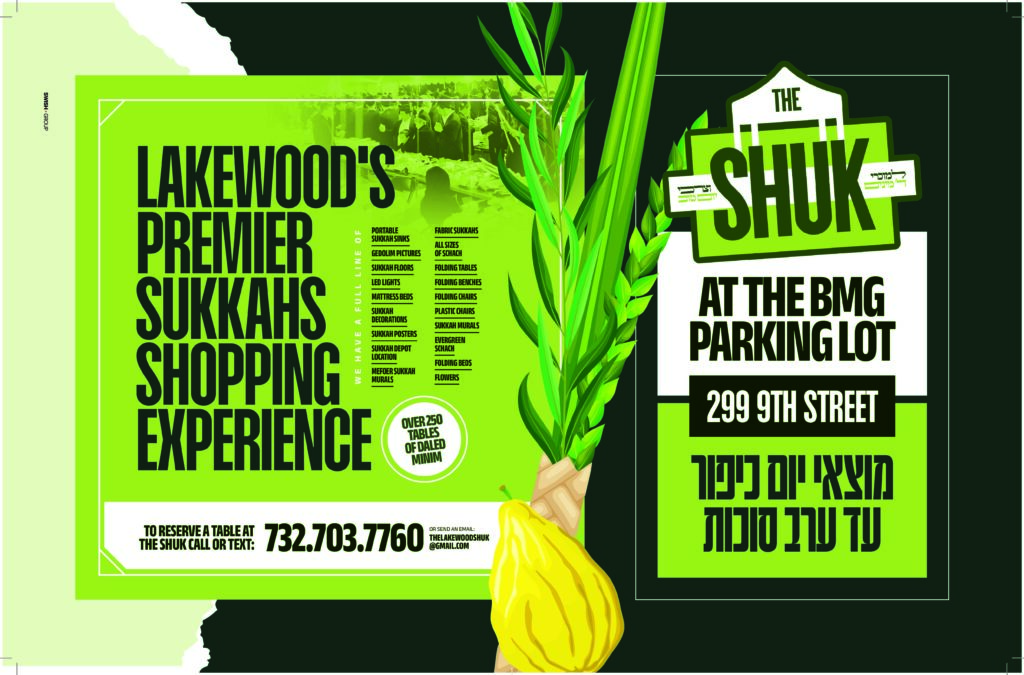 Every year, between Yom Kippur and Sukkos, the large BMG parking lot on 9th Street transforms into the central Dalet Minim Shuk of Lakewood. Thousands of families — not only from Lakewood, but from across the entire tri-state area — stream through its lively aisles, where hundreds of mochrim offer beautiful esrogim, lulavim, hadasim, and aravos, along with everything else needed for Yom Tov.