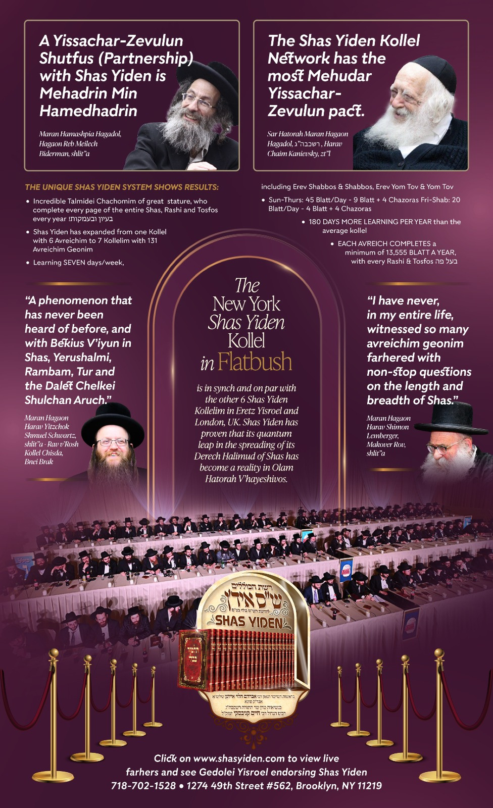 Sar Hatorah, Maran Hagaon Harav Chaim Kanievsky, zt”l, Nasi Shas Yiden, emphasized: The most mehudar Yissachar-Zevulun pact to support in our times is that offered by Shas Yiden – it comprises the entire Shas, Rashi and Tosfos – all in just one year!